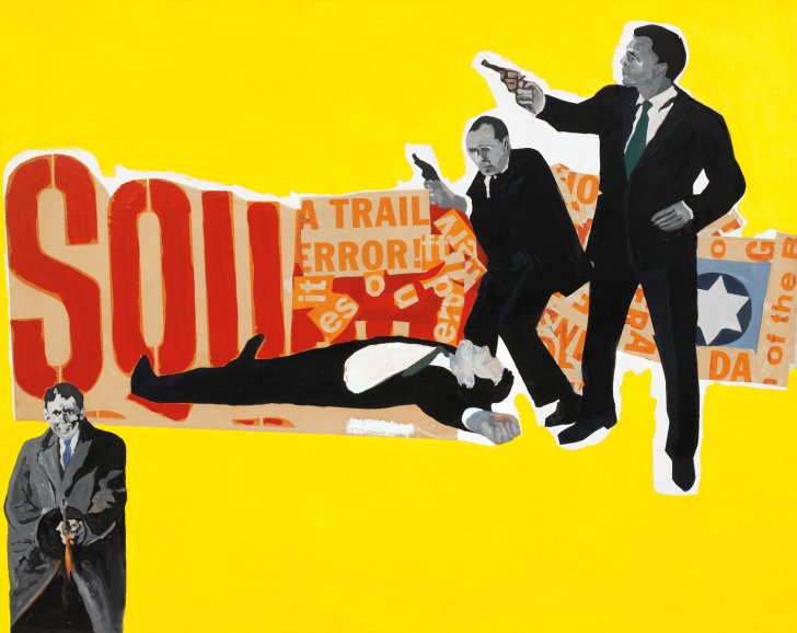 Rosalyn Drexler extended her observations of the representation of violence in society in a series of works featuring gangsters, businessmen, and law enforcement officials. She borrowed images from film posters, sales catalogs, newspapers, and television, looking at fictional representations of tough guys as well as real-life fistfights and shootouts.