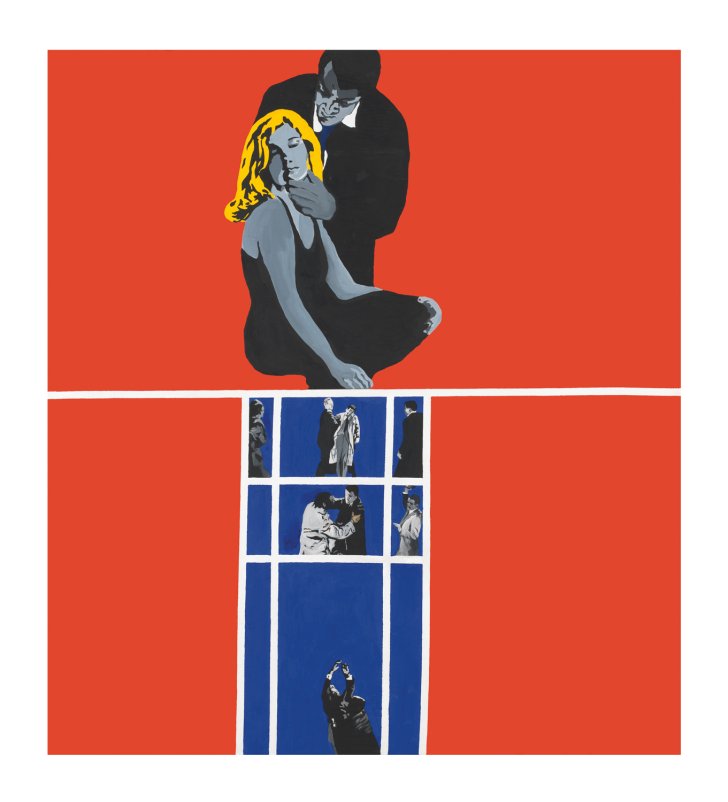 Caught in an erotic embrace, the couple depicted in Love and Violence (culled from the 1963 poster for the movie Toys in the Attic, starring Dean Martin) embodies the swooning pop-culture myth of love. Yet the way that Drexler isolates the figures, focusing on the man’s hold on the woman’s throat, brings out the underlying menace of the scene and underscores the grip of their socially determined romantic roles.