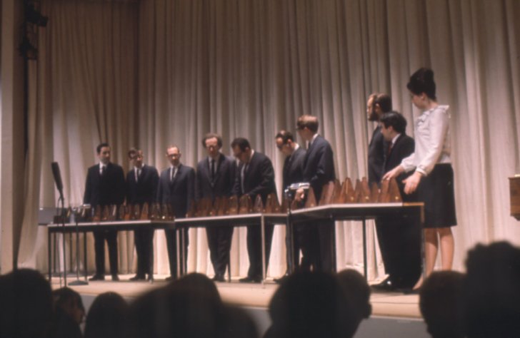 On March 4, 1965, members of The Center of the Creative and Performing Arts at the University at Buffalo performed György Ligeti's Poème symphonique, 1962, as part of the Buffalo Festival of the Arts Today in the Albright-Knox Auditorium.