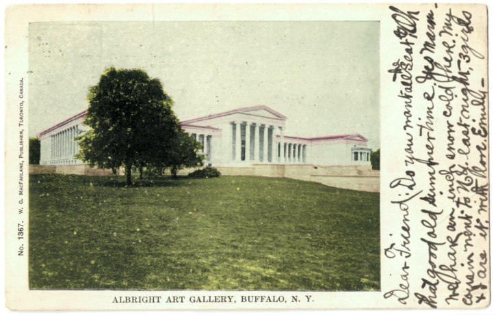 That might have been the intent of the person who first sent the Albright Art Gallery postcard, as well, who tells a friend in Wilmington, Delaware, about the weather in Lockport: “Oh that good old summertime. Yes warm. We have an inch snow, cold here.”