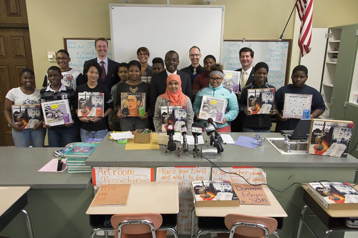 Peggy Pierce Elfvin Director Janne Sirén, Buffalo Public Schools Supervisor of Art Education Michele Agosto, Buffalo Mayor Byron Brown, Curator of Public Art Aaron Ott, and Erie County Executive Mark C. Poloncarz, with students holding their new art kits at the Buffalo Elementary School of Technology #6. Photograph by Tom Loonan.