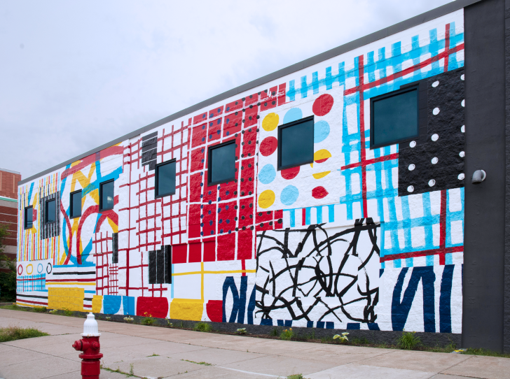 Tullet’s work is at its most meaningful when it is activating others and encouraging play. Motivated by his deep belief in working with community partners, Tullet shared his design for the mural with our partners at Buffalo Arts Studio, who collaborated with students in the Jump Start program, under the guidance of Andrea Pawarski, to complete the artwork here in Buffalo. The students used Polytab, a non-woven material that is easily transported and sectioned, to create the work in their studio space. They arranged, prepared, further developed, and painted the mural over the course of two intensive weeks at Buffalo Arts Studio.