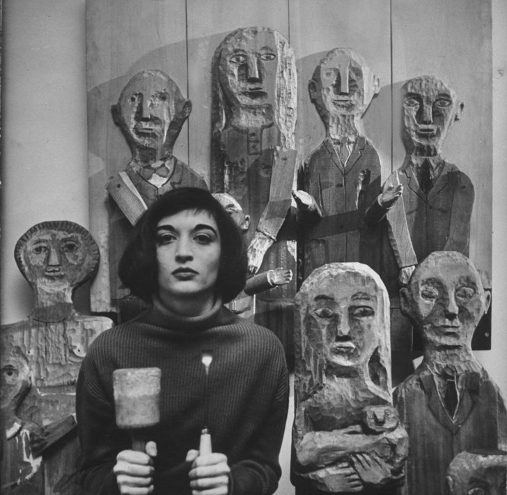 Walter Sanders (American, born Germany, 1897–1985). Marisol with her carved wood figures. Published in “Latin Beauty’s Host of Stern People, Staring Pets,” Life, July 14, 1958, 59.