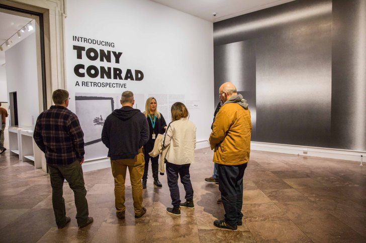 Curator Tina Rivers Ryan leads a gallery talk on Introducing Tony Conrad: A Retrospective on May 4, 2018. Photograph by MK Photo.