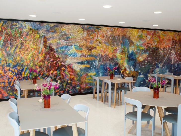 Interior of Cornelia, the Buffalo AKG’s café, with Firelei Báez’s Chorus of the Deep (something ephemeral and beautifully whole, when seen from the edge of one’s vision, too full when taken head on), 2023. Photo: Gregory Halpern.