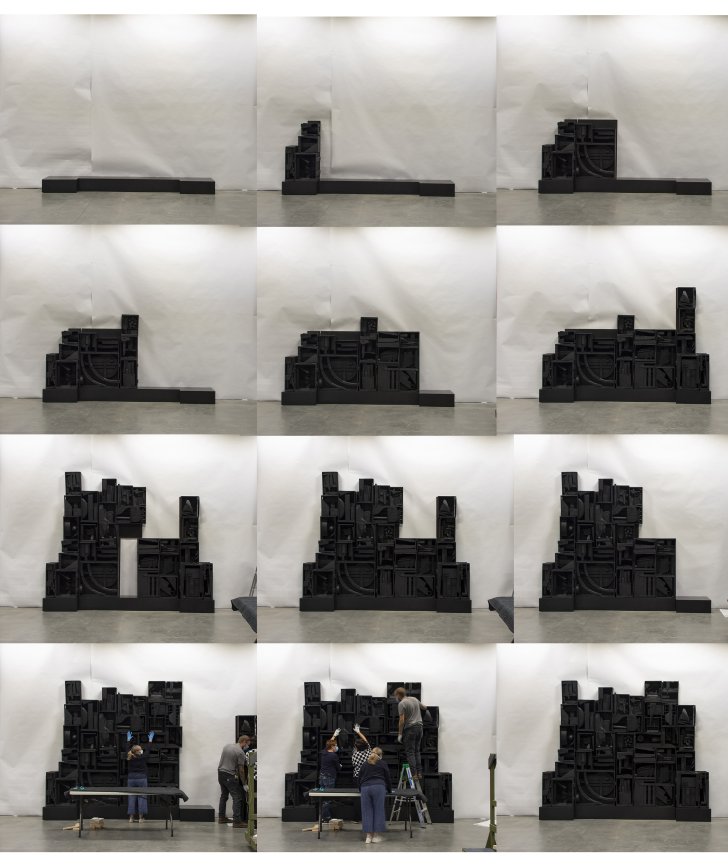 Composite of still images documenting the installation process of Louise Nevelson’s Sky Cathedral, 1958, by members of the Curatorial Department. Artwork: © Estate of Louise Nevelson / Artists Rights Society (ARS), New York. Video: Amanda Smith for Albright-Knox Art Gallery.