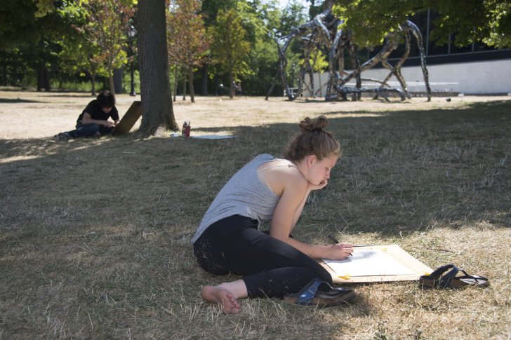 Students take their work outside on the AK campus, with Jason Middlebrook's Underlife, 2012-2013 in the background. Photograph by Tom Loonan