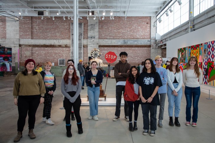 The 2022 AK Teens: Museum Ambassadors with Teen and Youth Programs Coordinator Samantha Serrano (left) in In These Truths at Albright-Knox Northland. Photo: Jeff Mace for Albright-Knox Art Gallery, Buffalo, New York