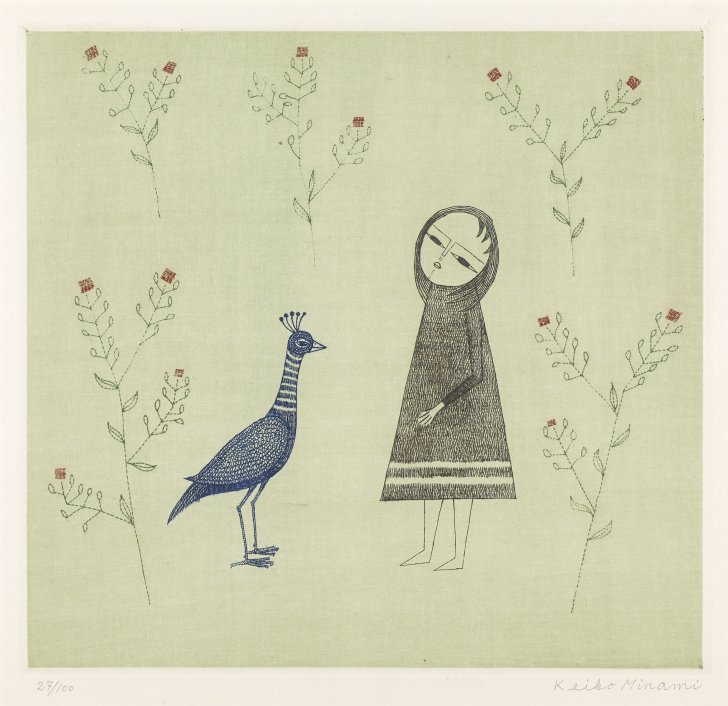 Keiko Minami (Japanese, 1911–2004). Small Girl with Bird, ca. 1950s. Etching, edition 27/100; 15 x 20 1/2 inches (38.1 x 52.1 cm). Collection Albright-Knox Art Gallery, Buffalo, New York; Gift of Frederic P. Norton, 1999 (P1999:6.399). © Estate of Keiko Minami.