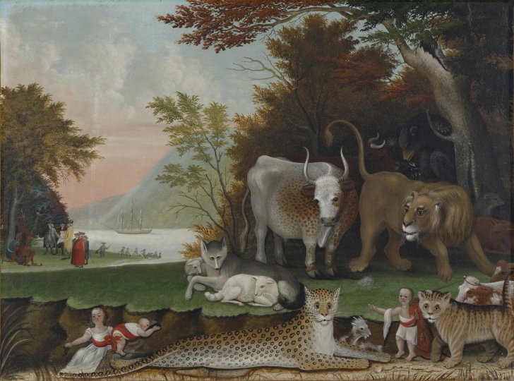Edward Hicks (American, 1780-1849). Peaceable Kingdom, ca. 1848. Oil on canvas, 23 7/8 x 31 7/8 inches (60.6 x 81 cm). Collection Albright-Knox Art Gallery, Buffalo, New York; James G. Forsyth Fund, 1940 (1940:18).