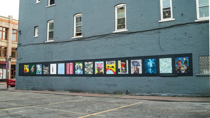 Installation view of Works, from Home, 2020, at 43 West Chippewa Street in Buffalo. From left to right, works by Karle Norman, Jay P Hawkins, Sr., Ashley Johnson, MJ Myers, Jason Seeley, Fotini Galanes, Adam Weekley, Sarah Myers, Chris Piontkowski, Obsidian Bellis, Rachel Shelton, Jon Mirro, Julia Bottoms, Tricia Butski, Jennifer Ryan, and Omniprism.