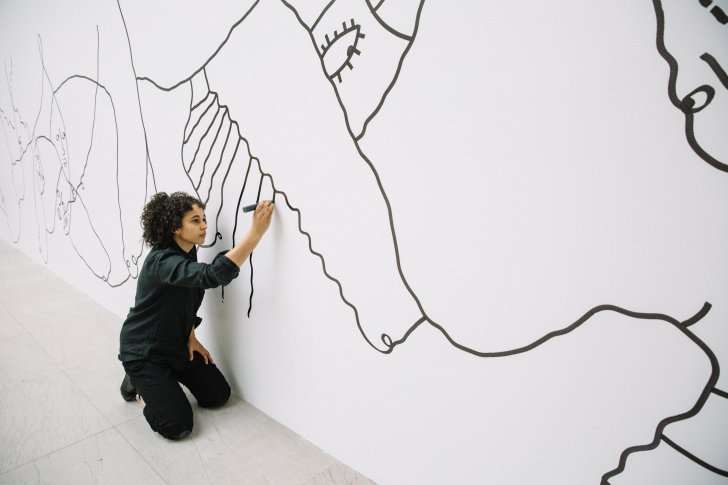 Shantell Martin working on a mural in the Albright-Knox's Sculpture Court. Photograph by Connie Tsang.