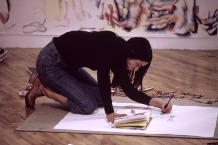 [Image: Marisol preparing works for New Drawings and Wall Sculpture by Marisol, Sidney Janis Gallery, New York, March 5–29, 1975. Photographic transparency. Marisol Papers, Buffalo AKG Art Museum. Digital Image: Amanda Smith, Buffalo AKG Art Museum]