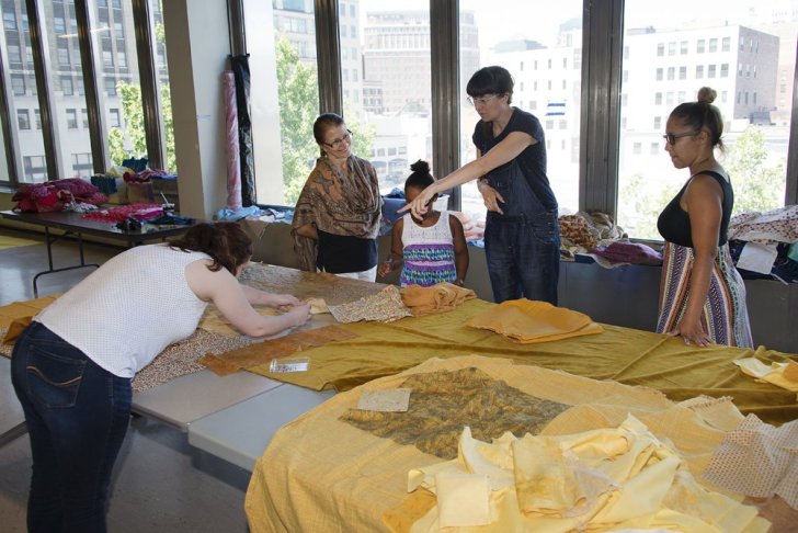 Amanda Browder and volunteers sew fabric for Spectral Locus at the Buffalo and Erie County Public Library's Central Library. Photo: Tom Loonan
