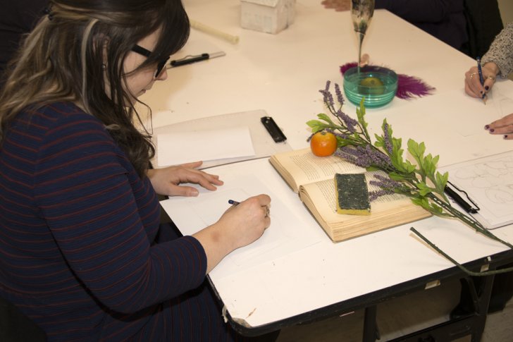 A workshop participant makes a still life drawing inspired by the exhibition For the Love of Things: Still Life on April 5, 2016. Photograph by Tom Loonan.