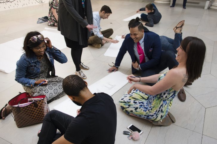 Guests play Exquisite Corpse in the Sculpture Court during M&T FIRST FRIDAYS on June 2, 2017. Photograph by Tom Loonan.