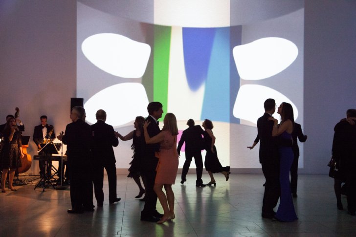 Guests dance in the Sculpture Court in front of Jeremy Blake’s Mod Lang, 2001. Photograph by Gigi Gatewood.