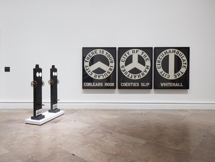 Installation view of Robert Indiana: A Sculpture Retrospective. From left: Ahab, 1962 (cast 1991); Ahab, 1962; and The Melville Triptych, 1962. Photograph by Tom Powel Imaging. © Morgan Art Foundation Ltd / Artist Rights Society (ARS), New York