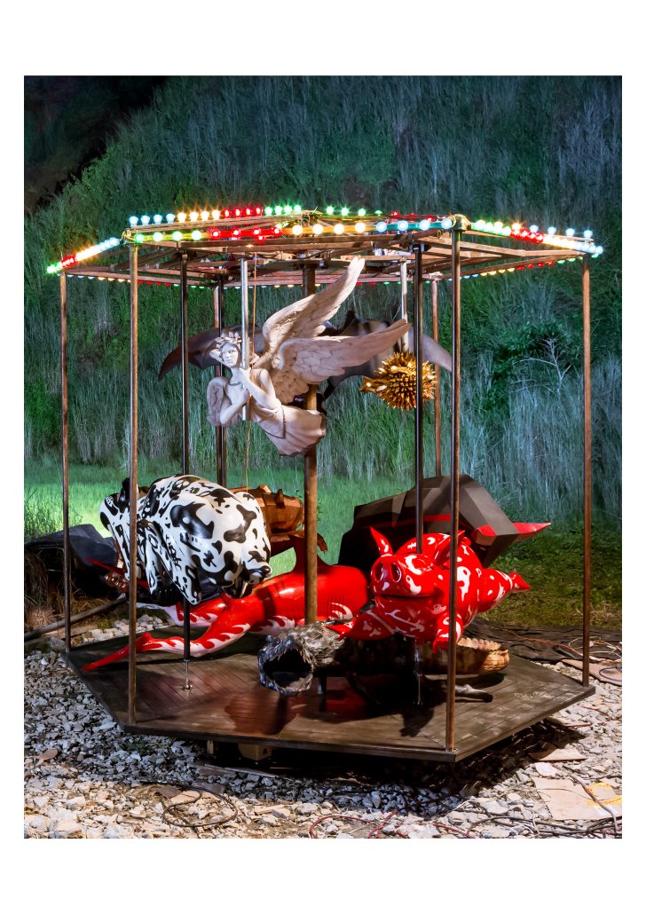 Ronald Ventura (Filipino, born 1973). Carousel, 2016. Revolving carousel sculpture with metal parts, motor, fiberglass figures, and sound speakers, diameter: 146 inches (370 cm), height: 197 inches (500 cm). Courtesy of the artist and Tyler Rollins Fine Art. Image courtesy of the artist and Tyler Rollins Fine Art.