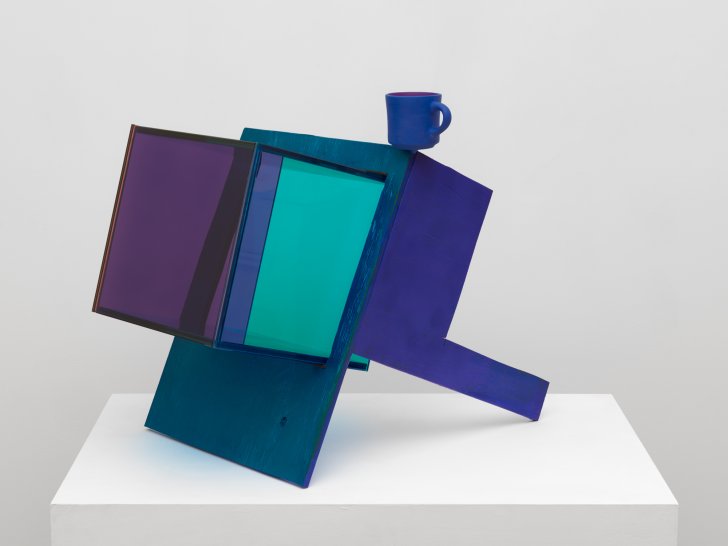 Sarah Braman (American, born 1970). Blue coffee, 2019. Painted aluminum and glass, 23 x 19 3/4 x 28 inches (58.4 x 50.2 x 71.1 cm). Courtesy of the artist and Mitchell-Innes & Nash, New York. © Sarah Braman.