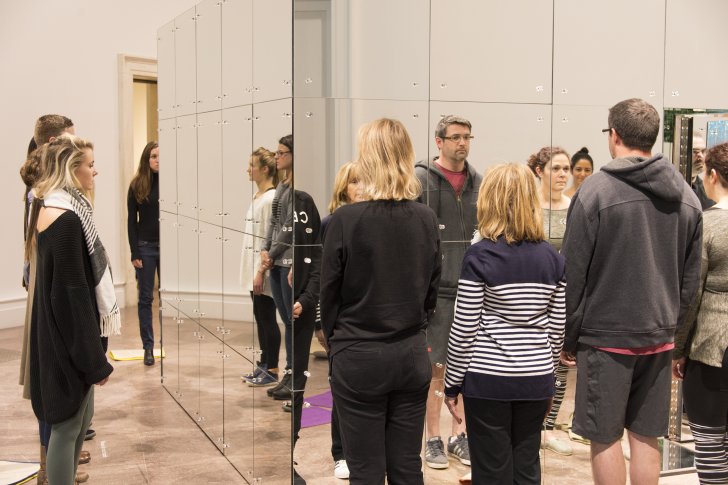 Guests meditate around Lucas Samaras's Mirrored Room, 1966, during Meditation at the Museum on November 16, 2017. Photograph by Tom Loonan.