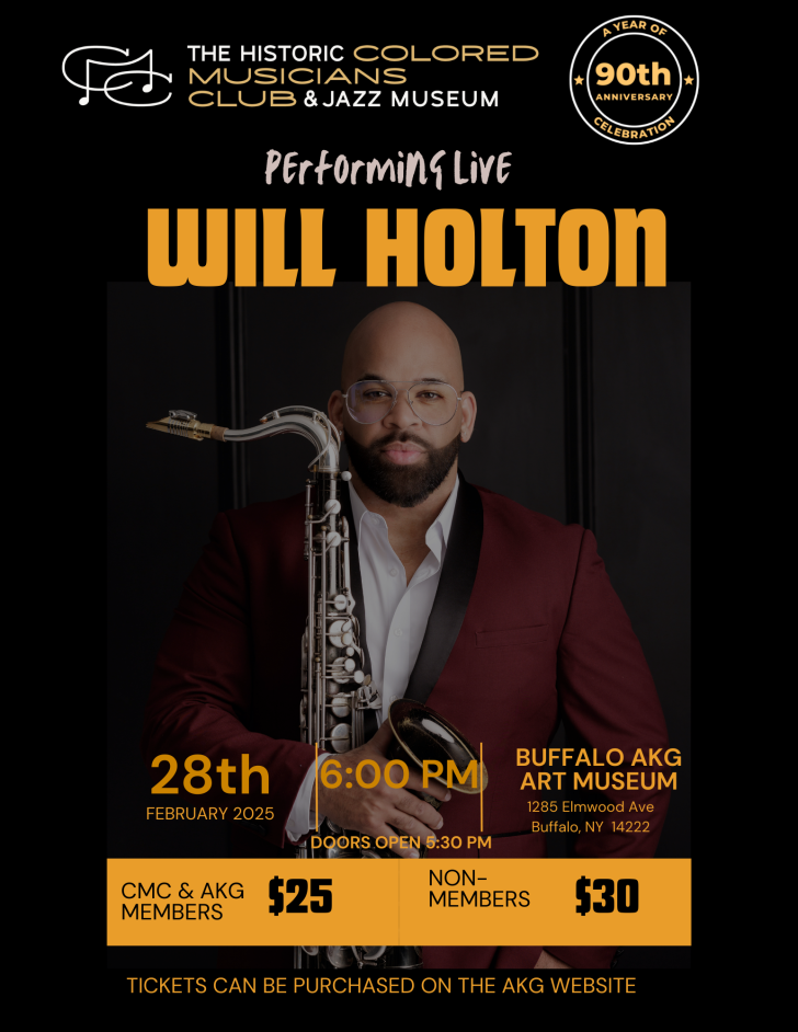 The Colored Musicians Club (CMC) is excited to present the start of its Emerging Artist Series. Will Holton will be the first of many upcoming artists from around the world to be featured. The Colored Musicians Club aims to bring live jazz to the Western New York area and beyond. Stay tuned for more exciting performances!