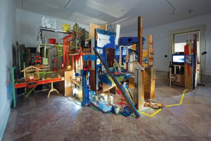 Installation view of Dennis Maher’s House of Collective Repair, 2012–13. Found objects, building materials, furniture, video, house models, and maps; dimensions variable. Courtesy the artist. Photograph by Biff Henrich / IMG_INK.