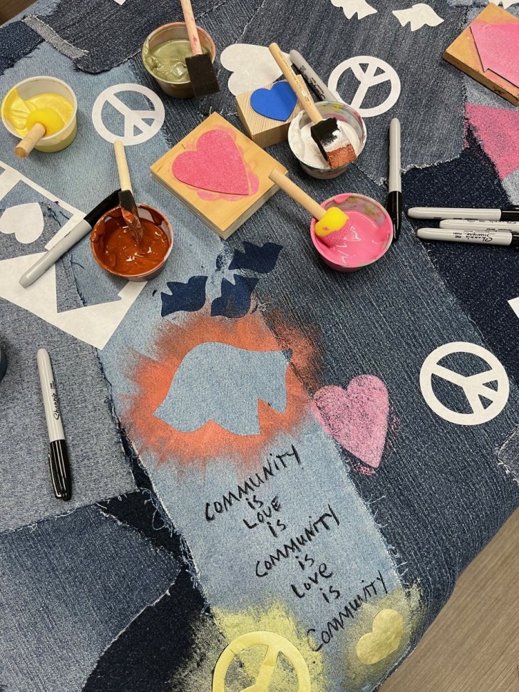 The Community Garland activity will allow participants to create a take-home project featuring pom-poms and many of the same symbols available for use on the Community Fabric—peace signs, houses, hearts, birds, and stars.