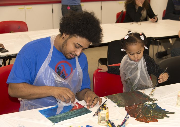 Toddlers—with their parents, guardians, or caregivers—participate in art activities involving a variety of fun materials. (Up to two additional children are welcome to participate with the toddler and adult.)