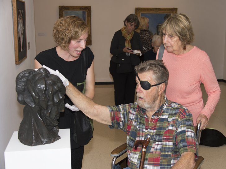 Accessibility and Community Programs Coordinator Teri Fallesen guides a visually impaired guest as part of the Veterans Connecting through Art program. Photograph by Tom Loonan.