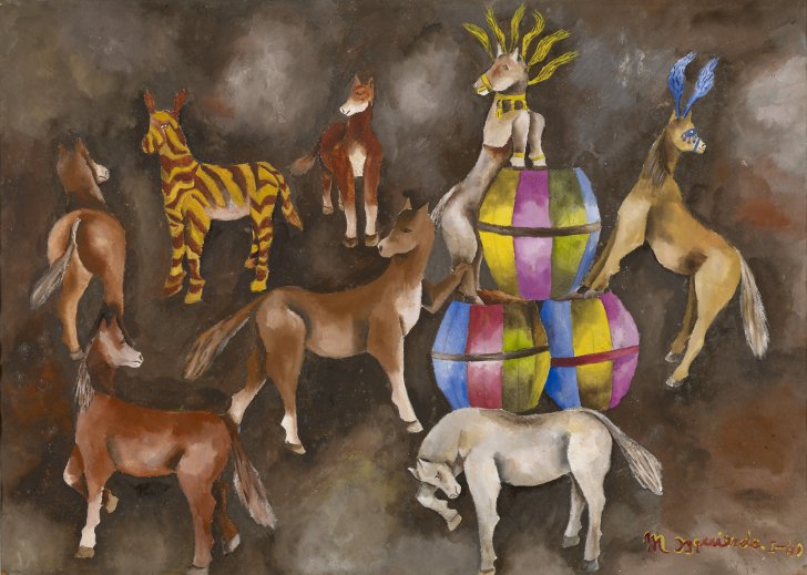 María Izquierdo (Mexican, 1902–1955). Horses Actors, 1940. Gouache on paper, 16 x 22 1/2 inches (40.6 x 57.2 cm). Collection Albright-Knox Art Gallery, Buffalo, New York; Room of Contemporary Art Fund, 1940 (RCA1940:10). © Estate of María Izquierdo.