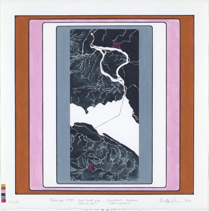 Millie Chen (Canadian, born Taiwan, 1962). Prototype 1978: Love Canal, USA (from 5km), Jonestown, Guyana (from 20km), 2016. Watercolor, gouache, and graphite on paper, 17 x 17 inches (43.2 x 43.2 cm). Collection Albright-Knox Art Gallery, Buffalo, New York; Charlotte A. Watson Fund, by exchange and Gift of Miss Amelia E. White, by exchange, 2017 (2017:11.9). © 2016 Millie Chen