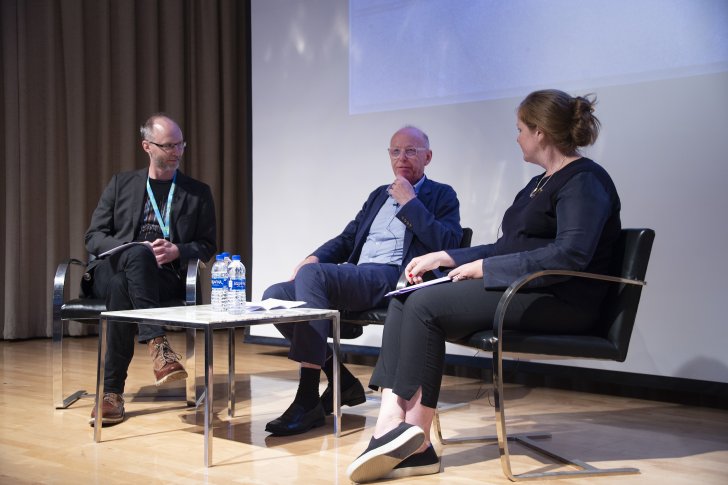Curator of Public Art Aaron Ott, artist Anthony McCall, and Chief Curator Cathleen Chaffee. Photograph by Tom Loonan.
