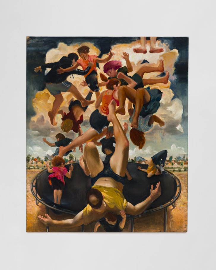 Larry Madrigal (Lives and works in Phoenix). Man on Trampoline, 2023. Oil on linen / Óleo sobre lino. 90 × 76 in. (228.6 × 193 cm). Courtesy of the artist and Nicodim. Photo: Yubo Dong, ofstudio photography