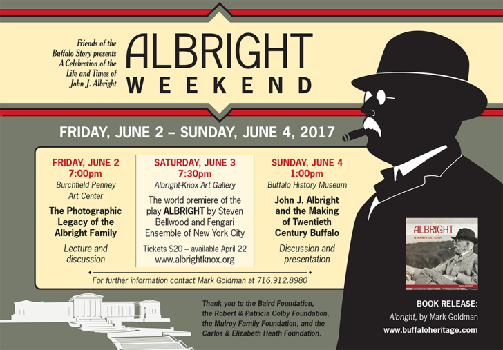 Friends of the Buffalo Story presents Albright Weekend, a celebration of the life and times of John J. Albright, from June 2 to 4, 2017. See the world premiere of the play Albright by Steven Bellwood and Fengari Ensemble of New York City at the Albright-Knox on Saturday, June 3, at 7:30 pm.