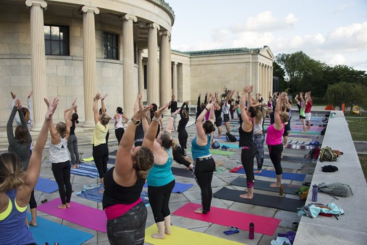 A yoga practice taking place on the Oishei Foundation Portico. Photo: Tom Loonan