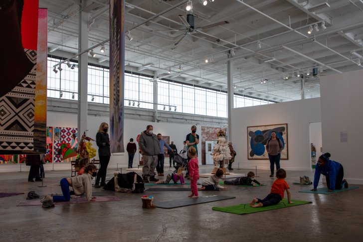 Families participate in a yoga class in the special exhibition In These Truths at Albright-Knox Northland. Photo: Jeff Mace for Albright-Knox Art Gallery, Buffalo, New York
