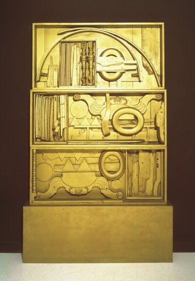 Louise Nevelson (American, born Ukraine, 1899–1988). Royal Game I, 1961. Wood, painted gold, 69 x 51 1/2 x 8 1/4 inches (175.3 x 130.8 x 21 cm). Collection Albright-Knox Art Gallery, Buffalo, New York; Gift of Seymour H. Knox, Jr., 1962 (K1962:9). © Artists Rights Society (ARS), New York.