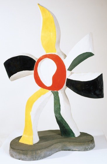 The Walking Flower, 1951, is one of only a few freestanding sculptures that Léger made during his career. It was created in Biot, France, where he moved in 1949 and began working in ceramics. The cheerful-looking flower has six petals. The flower is shown posed in mid-stride on two petals, provoking debate as to which of the other four petals might be arms or a head. The sculpture is painted with five glazes on the front—yellow, red-orange, green, black, and off-white. The design on the back is similar, but painted in black and off-white only.