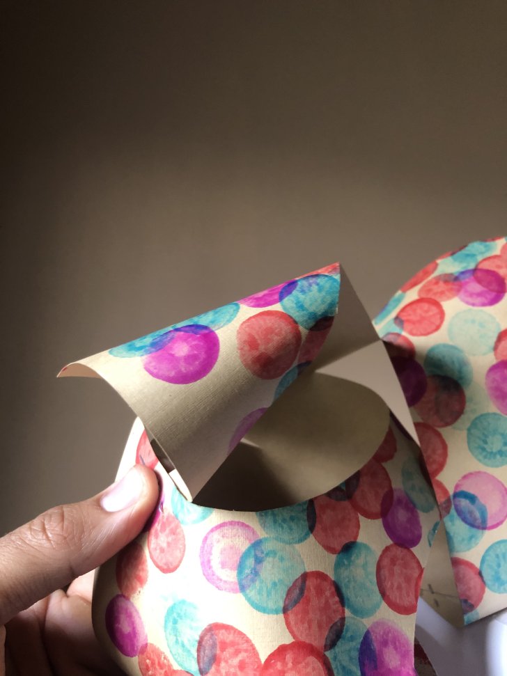 3. Fold and bend the cut pieces inward to create negative space in between the loops. Secure the loops at connecting points of paper with your glue, tape, or stapler.