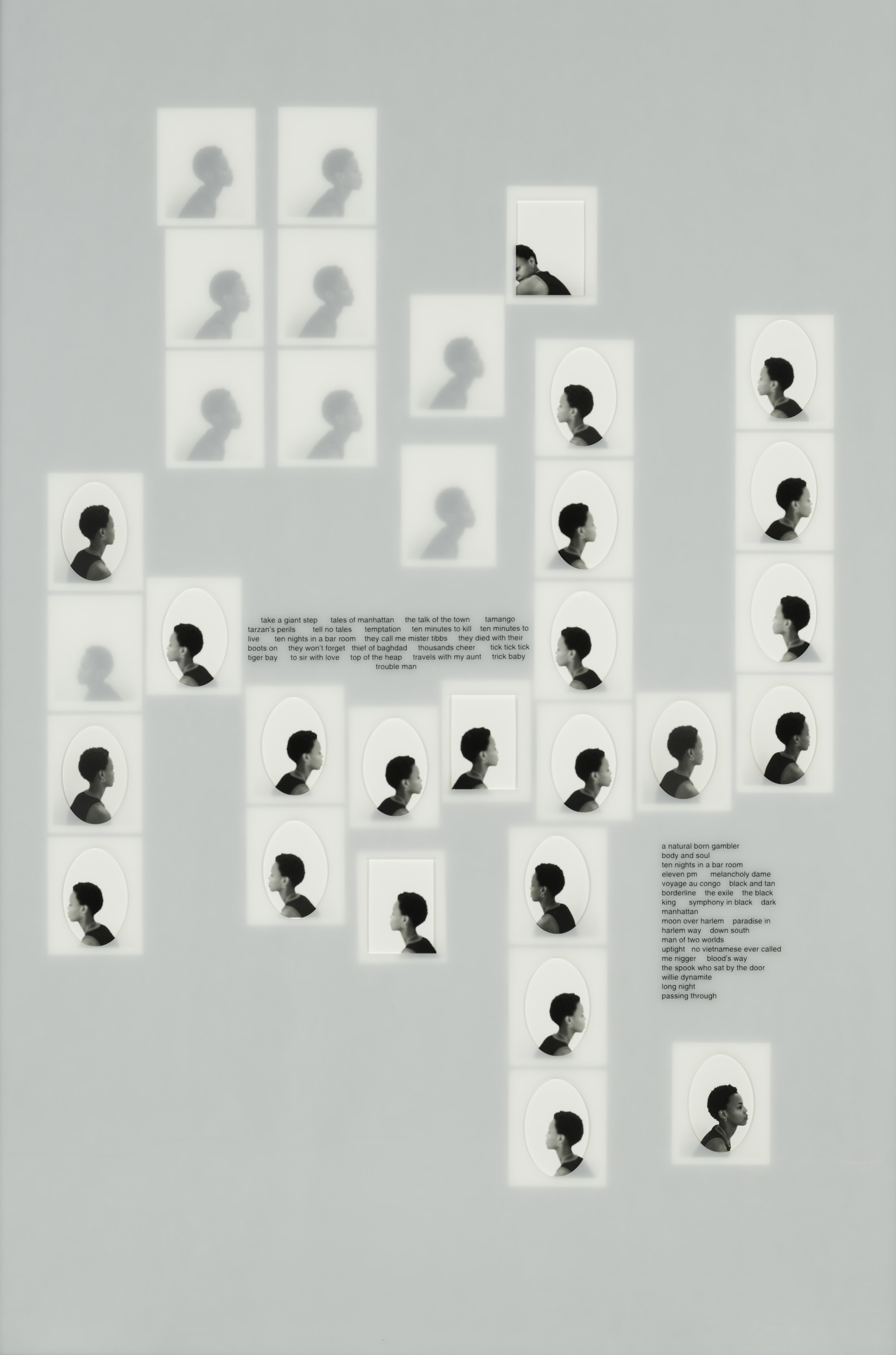 This untitled photograph is one of a series of twelve completed in the fall of 2001. It includes several almost identical photographic portraits of an anonymous African American woman accompanied by text and framed and matted in semi-translucent Plexiglas. The silhouettes evoke historical modes of portraiture, including oval-shaped Victorian daguerreotypes and a celebrated bust of the ancient Egyptian Queen Nefertiti. The arrangement of the images in repetitive rows calls to mind a cinematic storyboard or filmstrip. The text was selected from titles of paintings and films in which Africans or African Americans are significant or involved in some way. Simpson’s background in art history, experimental film, and films of the fifties, sixties, and seventies provided rich source material for the series.