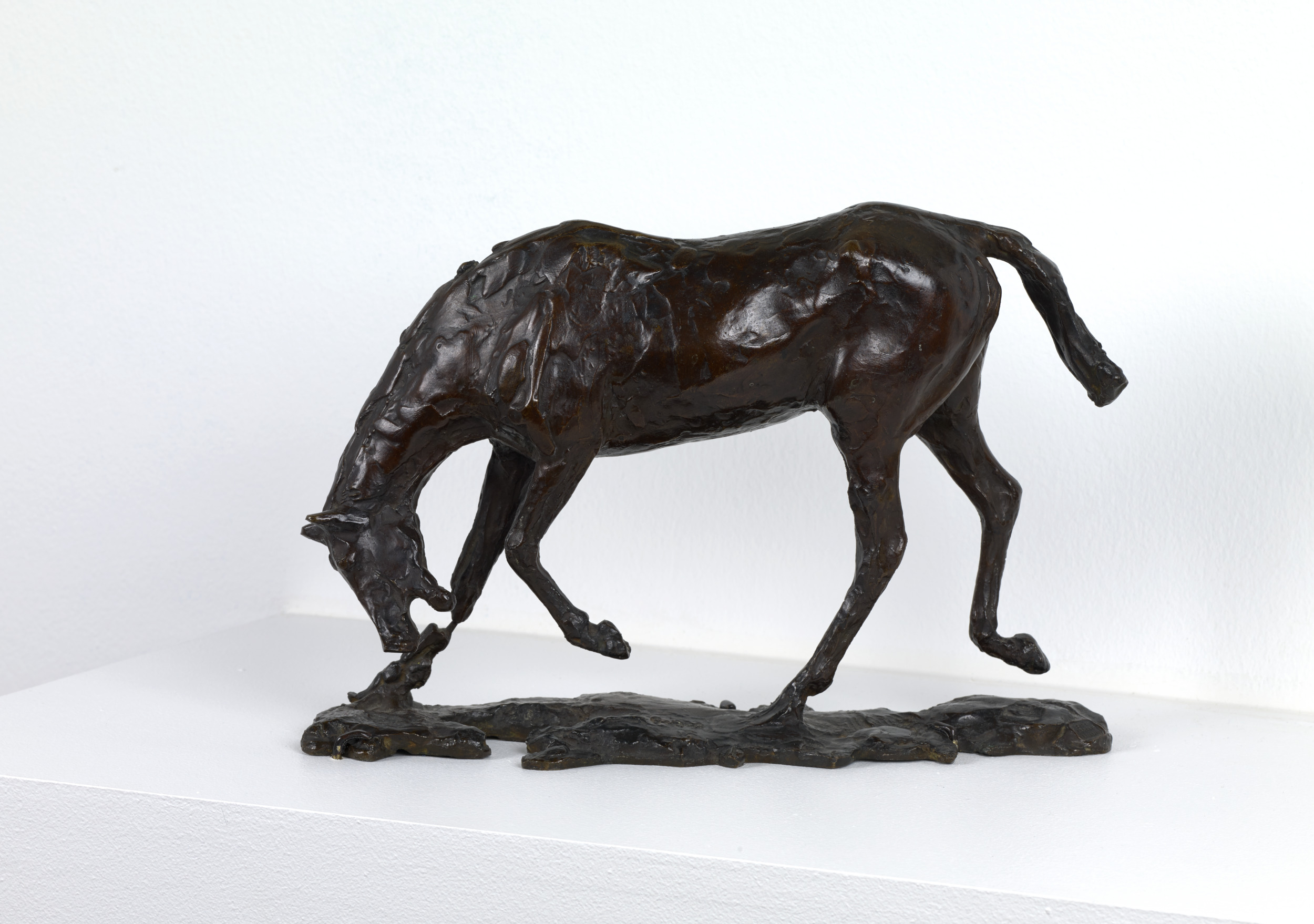 Throughout his career, Edgar Degas took an interest in equestrian scenes and executed numerous works on the theme. Most of the horses he chose to depict were Thoroughbreds: horses bred specifically for speed and as potential competitive racers. As Degas spent time with such animals, he further developed an innate ability to capture their elegant, spirited movements. After the artist’s death, nearly one hundred and fifty clay and wax maquettes of horses and other subjects were discovered in his studio and apartment. Although it may never have been the artist’s intention to distinguish these works with the permanence of bronze, Degas’s heirs approved the casting of seventy-two figures from this group, including Horse with Head Lowered. Acting more like three-dimensional sketches, such objects allowed the artist to further explore the dynamics of movement and muscular tension within the body.