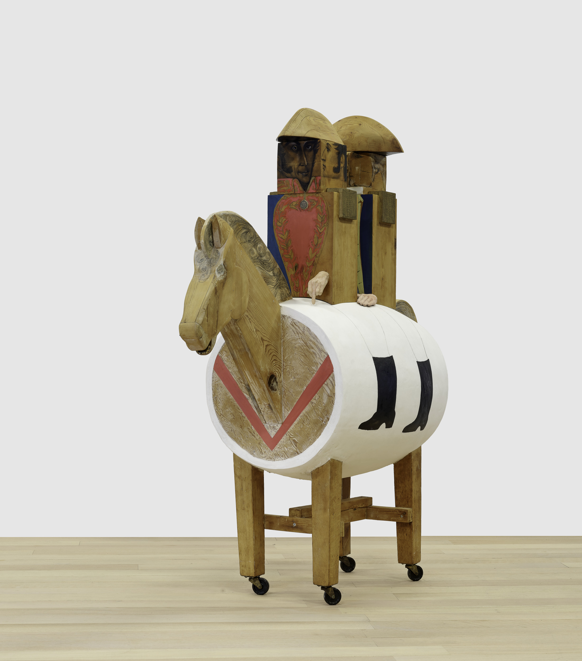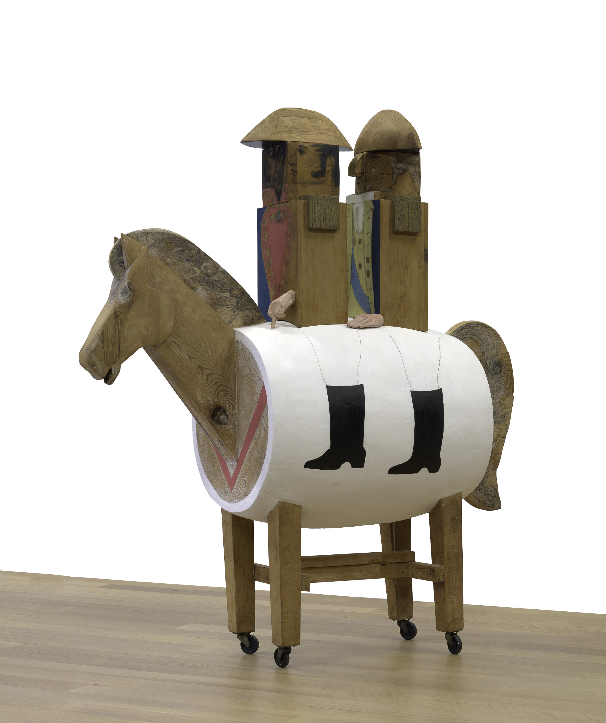 The Generals features nearly life-size sculptural caricatures of George Washington and the Venezuelan military and political leader Simón Bolívar sitting on a toy horse. Some areas, such as the face of the Bolívar figure, are meticulously rendered, while others are intentionally left seemingly unfinished. The hands of both figures are casts of Marisol's own, giving the sculpture an eerily realistic layer. When the work was first exhibited at the Albright-Knox soon after its acquisition in 1962, a recording of a march entitled “Koronal Kreplach” by the American composer David Amram, a friend of the artist, emanated from the body of the horse. Amram had originally written the score for a Broadway play called The Rivalry, but when Marisol heard it and walked around the sculpture, she found the combination amusing and decided to incorporate it into her work.