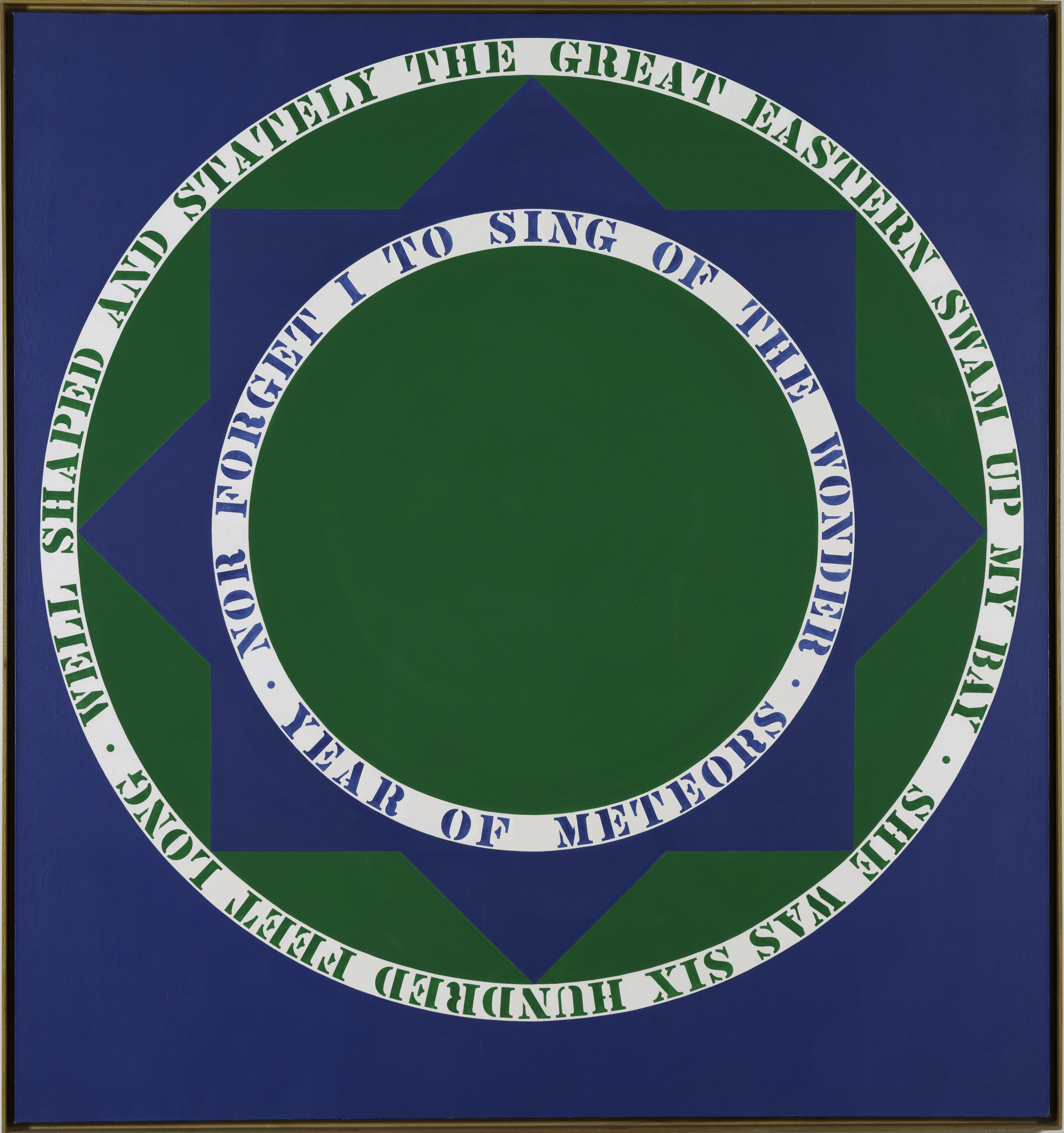 Year of Meteors is one of several “literary paintings” Robert Indiana created during the early 1960s. The painting’s central geometric motif, a compass rose with eight points and two concentric circles, provides the architecture for passages from Walt Whitman’s poem “Year of Meteors,” published in Leaves of Grass. In his poem, Whitman reflects on events of 1859 and 1860, including the passage of the ship the Great Eastern (an engineering marvel) through New York Harbor, the presidential election of Abraham Lincoln, and a rare meteor procession.