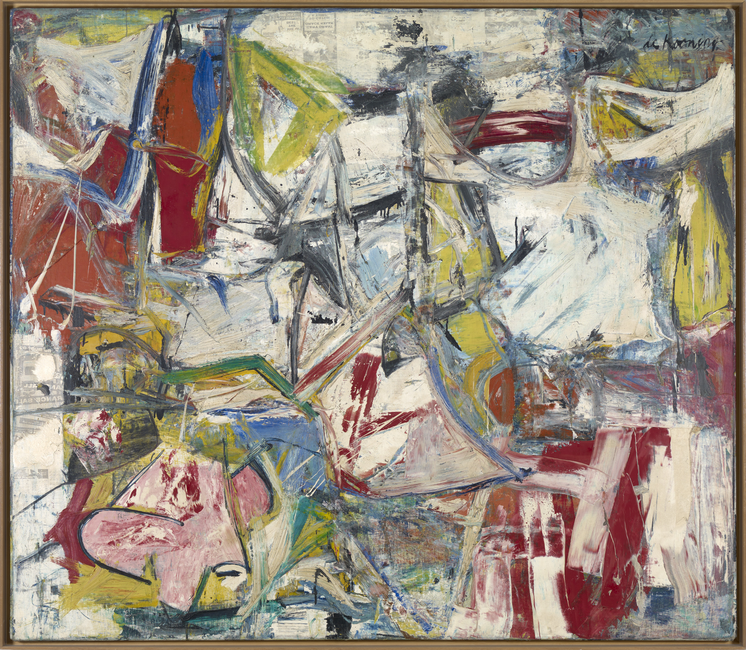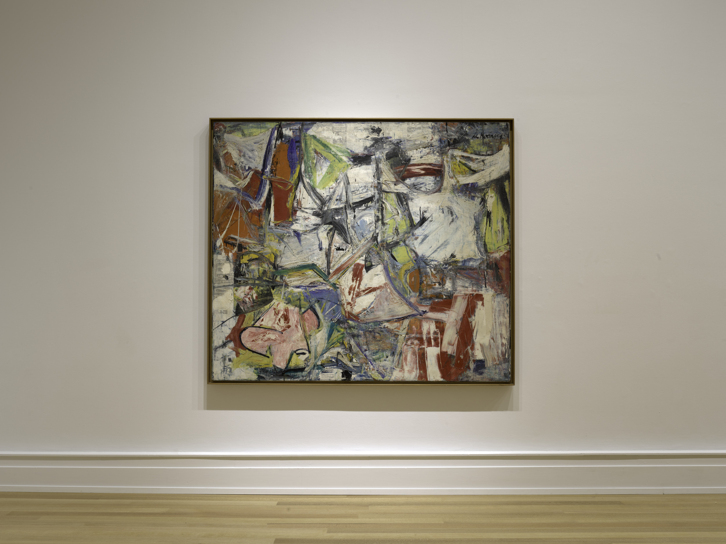 While Willem de Kooning's paintings often look as though the artist worked very quickly, the opposite is in fact true. Although he did create his images spontaneously, without preparatory drawings, he placed each mark with careful consideration. The next day he often reworked what he had previously done. Since wet paint is much easier to manipulate, de Kooning often covered the surface at night with newspaper to slow down the drying process. Occasionally the newsprint would transfer to the work’s surface; when this happened, he either painted over it or decided he liked the effect and left it. Gotham News is in some ways an expression of life in New York, where de Kooning was living at the time: crowded, confusing, and violent to some people, while exciting, colorful, and energetic to others. And, for many, this city is a mixture of both these circles of sentiment. "Gotham" is the New York–equivalent setting of the Batman comics, and "News" undoubtedly refers to the newsprint seen on the lower left and top center of the canvas.