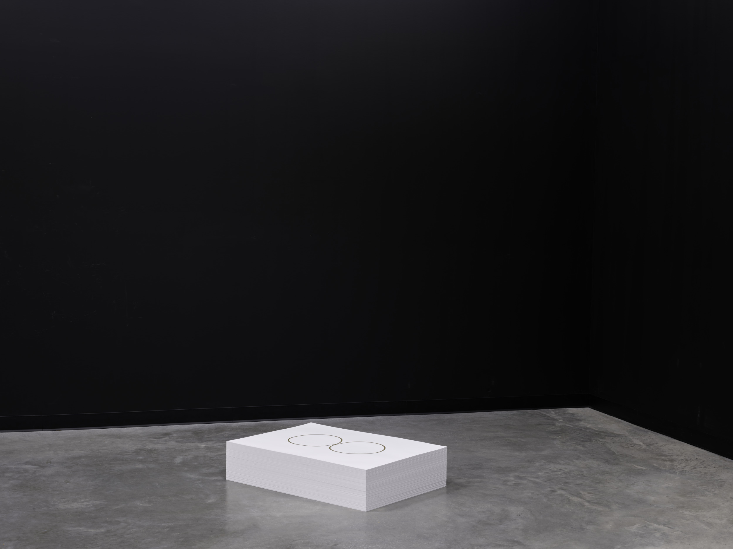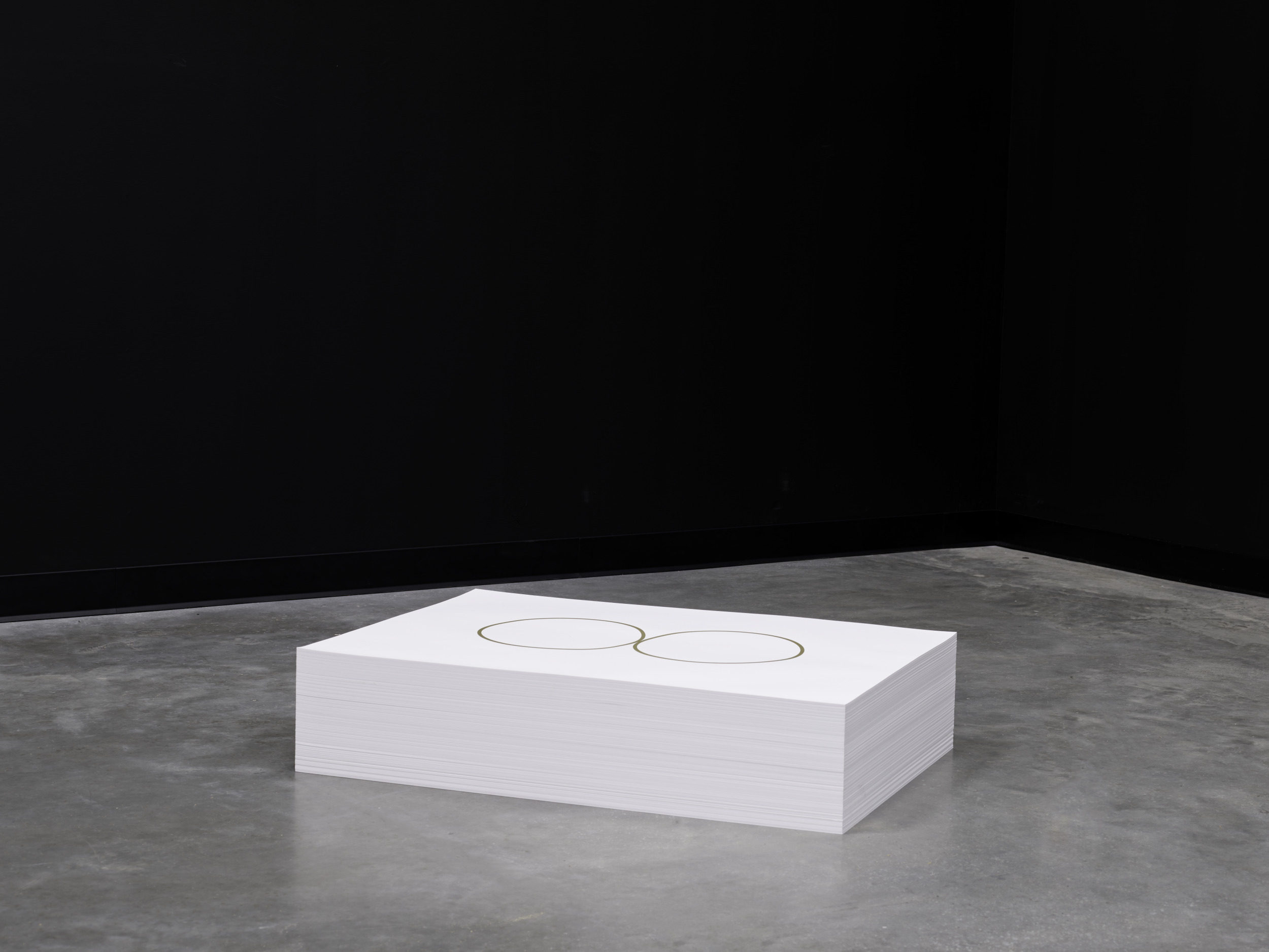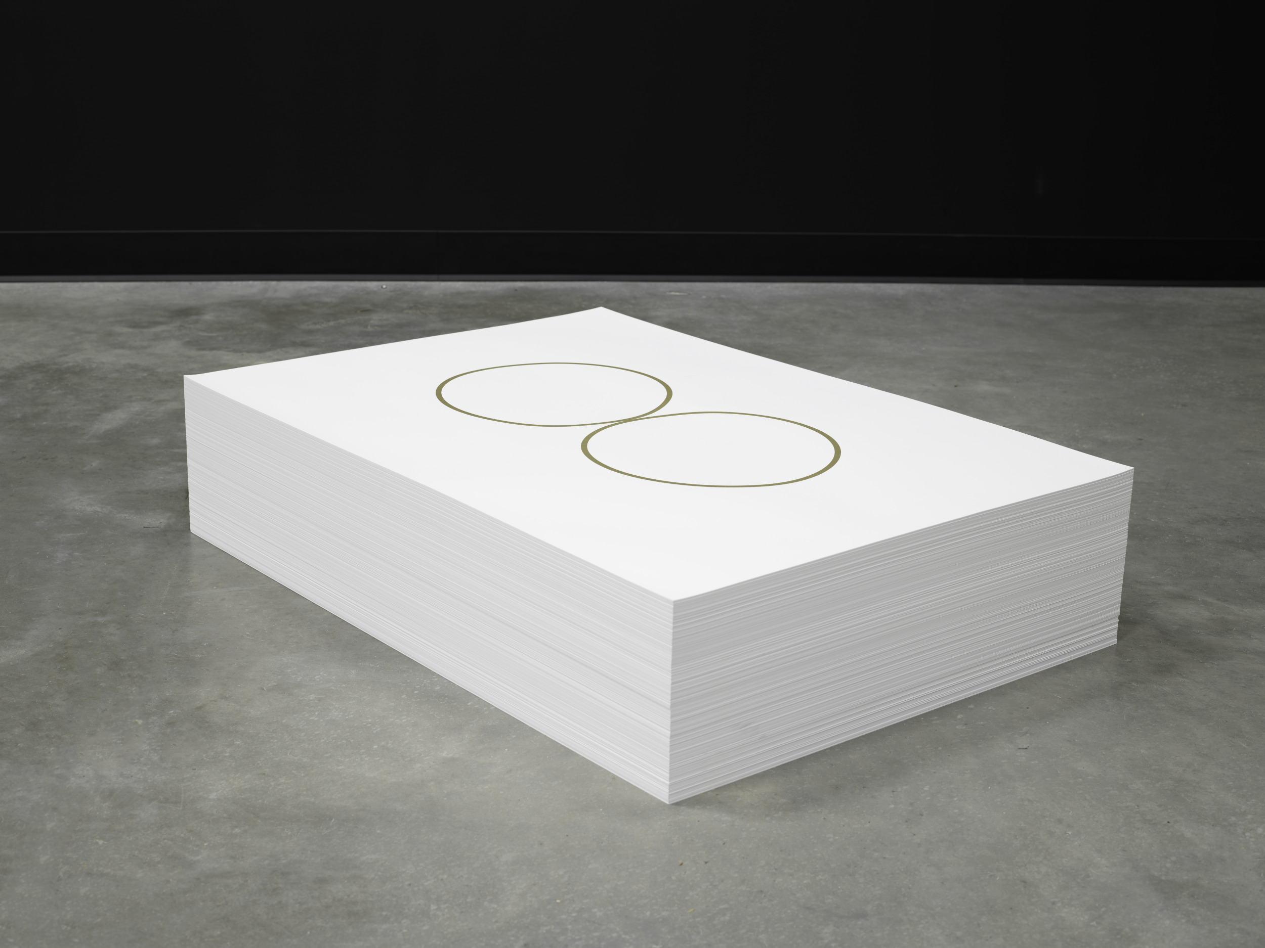 Untitled (Double Portrait) is from the artist’s “stack” series and is made up of hundreds of sheets of paper featuring an image of two circles printed in lustrous gold. They are presented in a neat pile on the museum floor, available for visitors to take away; infinite numbers of new copies may be printed. The image this work carries represents one of the most important themes found in Gonzalez-Torres’s work: the pairing of two people in togetherness, solidarity, and love. These “anti-monuments,” as the artist described his “stack” works, are meant to symbolize the acts of loss and regeneration. Gonzalez-Torres also desired to subvert the traditional “look but do not touch” rules often associated with viewing and experiencing works of art.