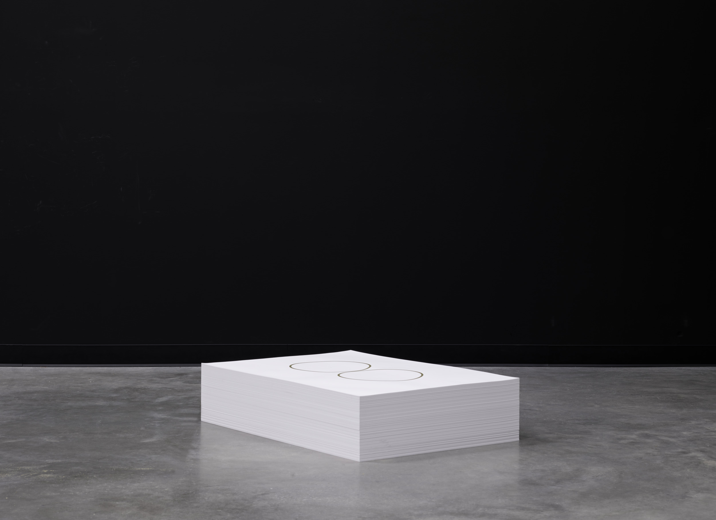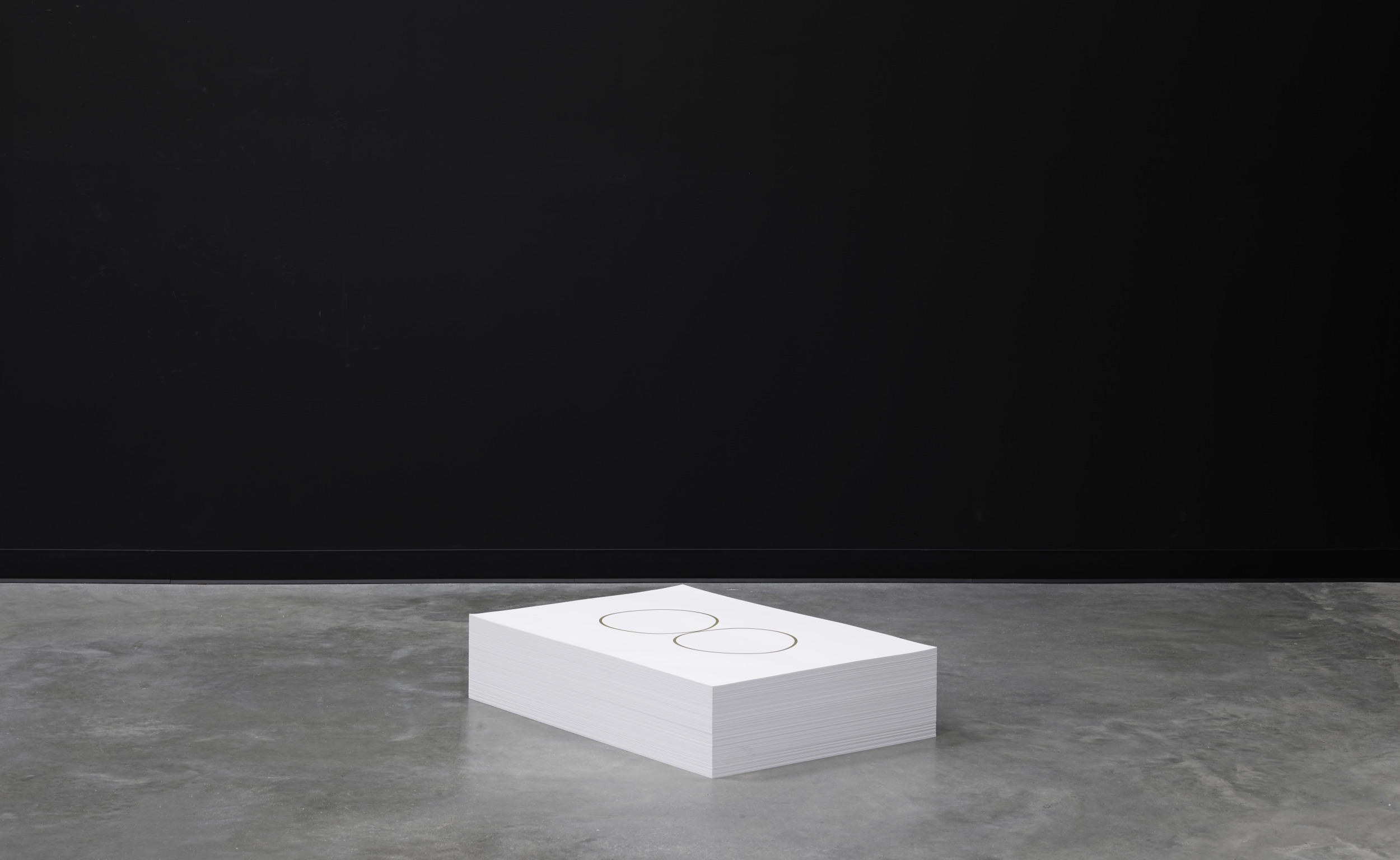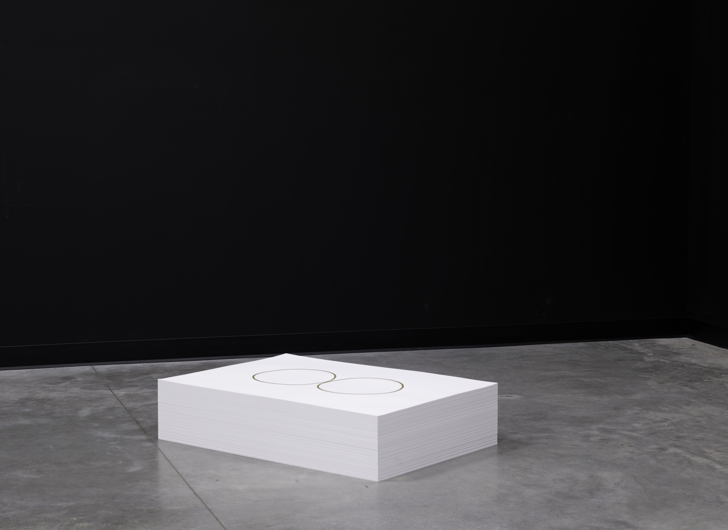 Untitled (Double Portrait) is from the artist’s “stack” series and is made up of hundreds of sheets of paper featuring an image of two circles printed in lustrous gold. They are presented in a neat pile on the museum floor, available for visitors to take away; infinite numbers of new copies may be printed. The image this work carries represents one of the most important themes found in Gonzalez-Torres’s work: the pairing of two people in togetherness, solidarity, and love. These “anti-monuments,” as the artist described his “stack” works, are meant to symbolize the acts of loss and regeneration. Gonzalez-Torres also desired to subvert the traditional “look but do not touch” rules often associated with viewing and experiencing works of art.