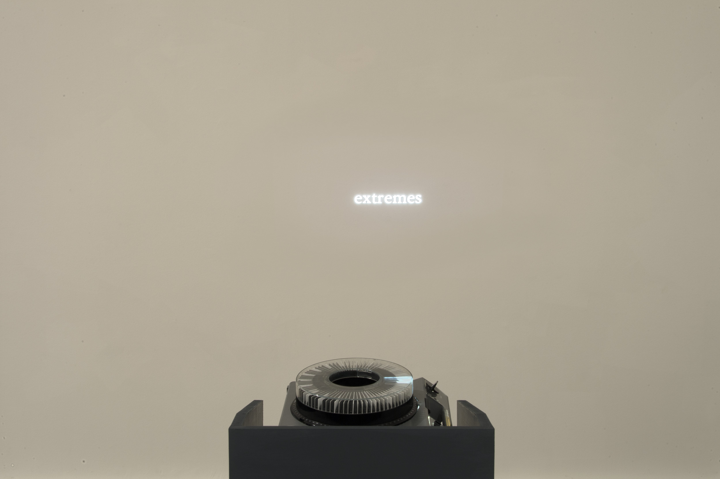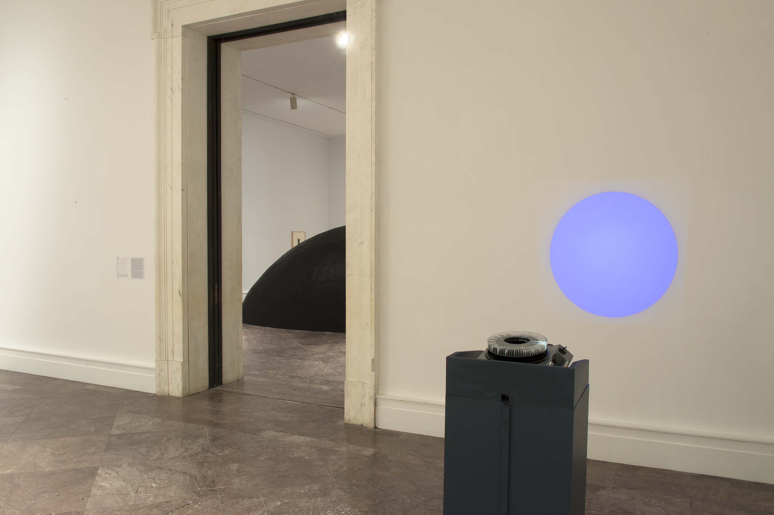 In a 1978 interview Robert Barry explained that in his slide works, “my point is to allow a word to be itself.” This slide projection comprises twenty text-based slides that each features a single noun that reflects an abstract concept rich with potential meaning. The slides progress slowly and are punctuated by both blank slides and those featuring a large blue circle, introducing a rhythm of visual and cognitive pauses between words. This pacing prevents the words from being read as literature or narrative, making it impossible to assign a precise, contextually based meaning to each word. By projecting each word directly on the wall of the exhibition space, Barry allows viewers to concentrate on the visual and formal aspects of these fragments of language, dimensions usually overlooked in the process of reading.