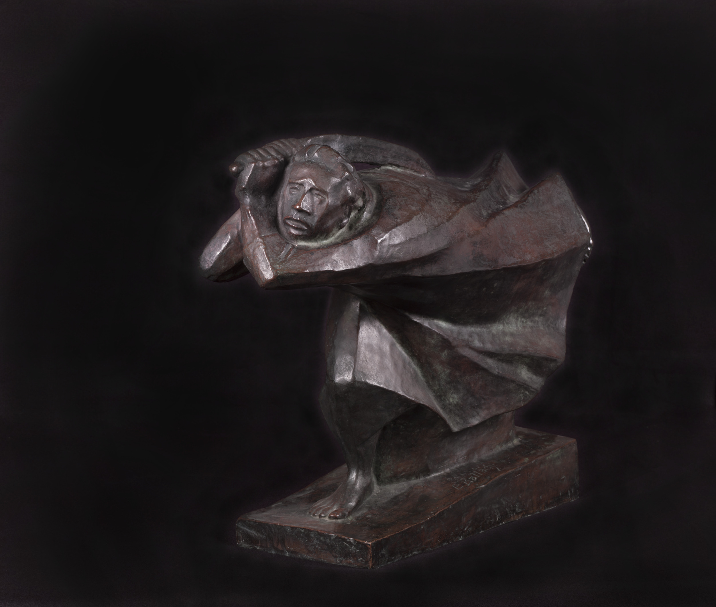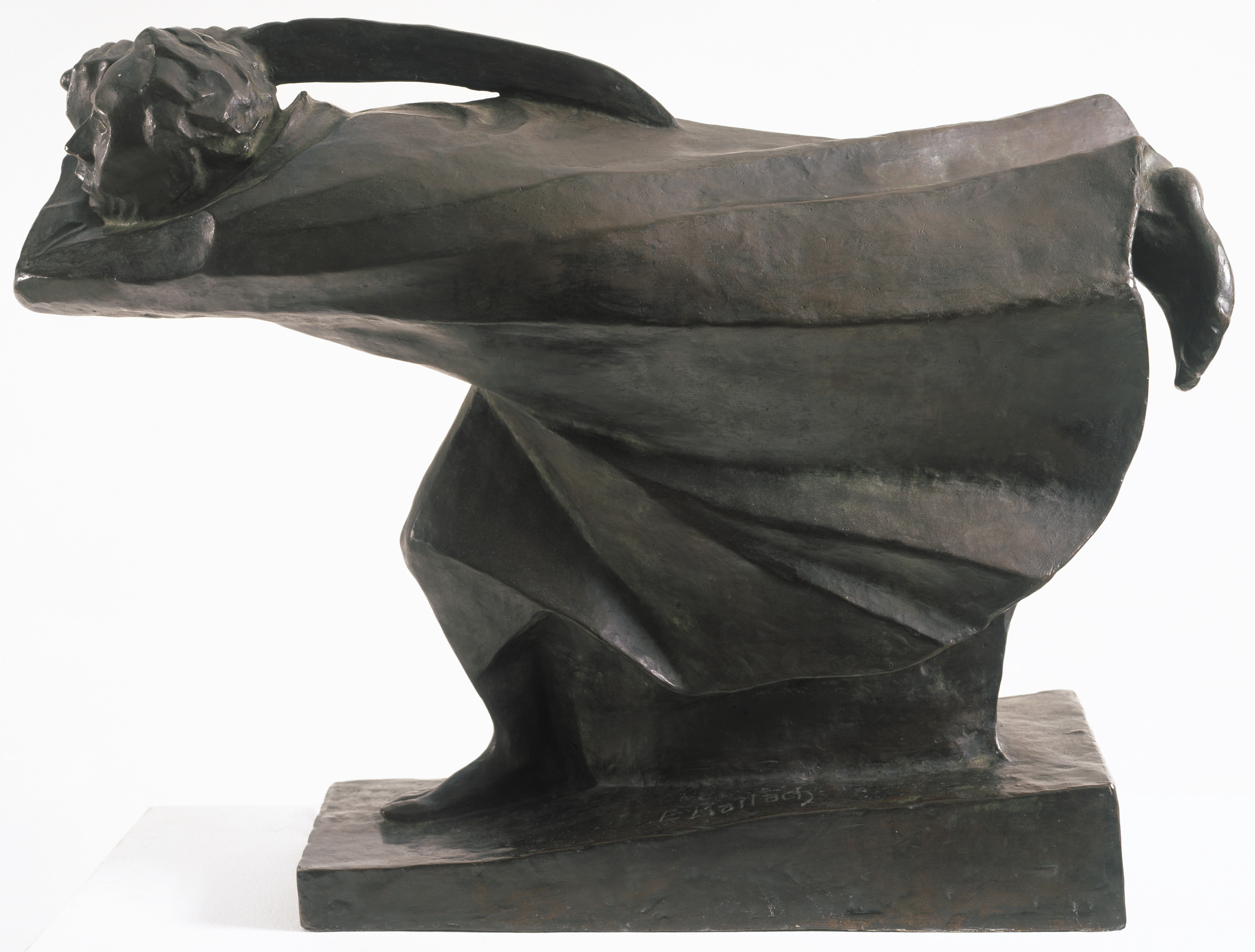 Ernst Barlach was aligned with the Expressionists, a group of artists working in Germany at the turn of the twentieth century who sought to convey emotional experiences in their work. The Avenger represents Barlach’s response to the outbreak of World War I in 1914. The force of the subject’s forward movement is emphasized through the sculpture’s horizontal orientation, its slanted base, and the way the figure’s cloak blows back in diagonal folds. He carries a weapon and raises it to strike with a gesture that is simultaneously heroic and tragic. However, his facial expression is ambiguous. This work represents not only the physical experience of war but also the psychological effects.