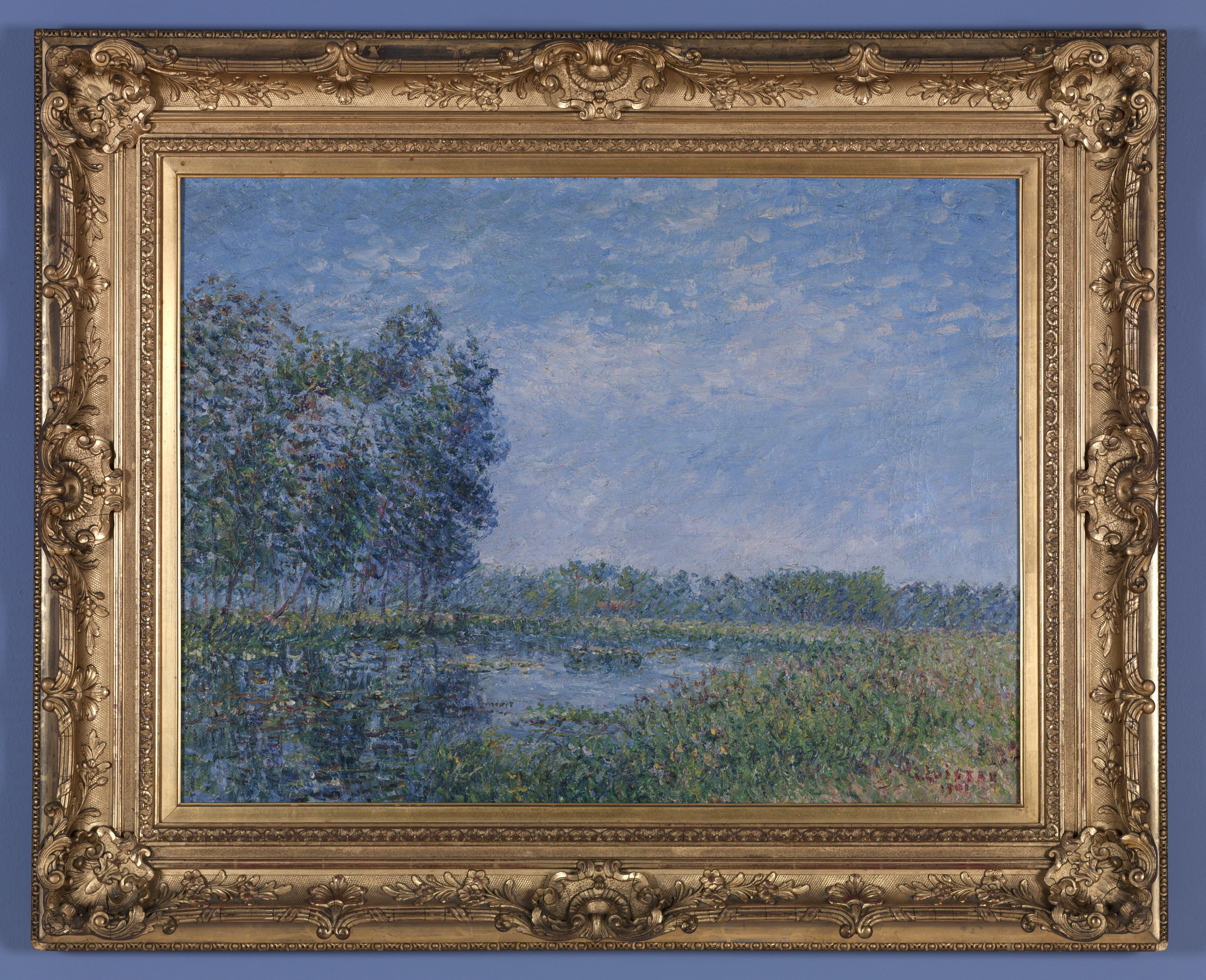 During a trip to Brittany in 1890, Gustave Loiseau became acquainted with Paul Gauguin and other artists that were members of the Pont-Aven school. By 1895, however, Loiseau joined the Impressionists, developing bravura and motifs that he carried on well into the twentieth century. One of Loiseau’s favorite subjects was the change in seasons. Banks of the Eure, Normandy exemplifies Loiseau’s soft palette and methodical application of paint. Its style is closest in affinity with the late technique of Camille Pissarro and Georges Seurat. Eventually, after experimenting with the methods in current use by fellow artists, he developed his own post-Impressionist style known as en treillis—a scratch-like cross-hatching reminiscent of a pattern made by a trellis—which further imbued his work with depth and texture.